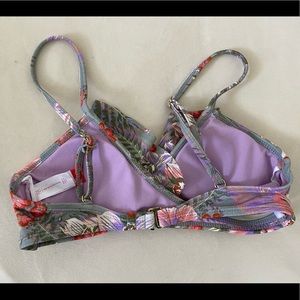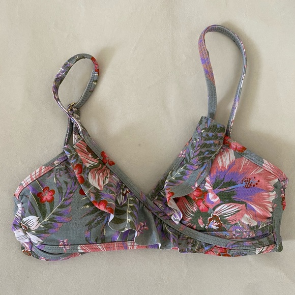 Floral design, barely worn, comfy, ruffles around top of boob area, adjustable straps, has a wrap design