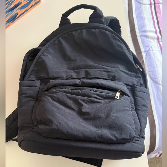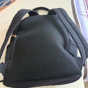 Stylish black backpack for men and women. Ideal for everyday use. Features multiple compartments. Laptop holder included inside