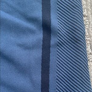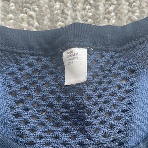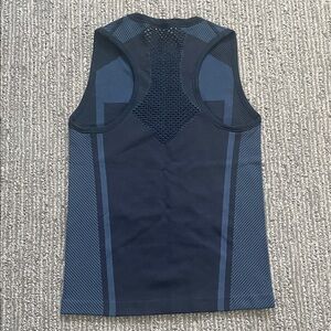 Stylish blue athletic tank top. Features a sleek design. Perfect for casual wear. Thick ribbed material. Cutout design in the back. Smoke free home.