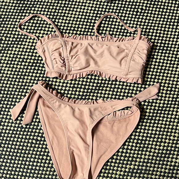 Chic bikini with ruffle details. Perfect for poolside lounging. Comfortable and stylish. Top size m bottom size s
