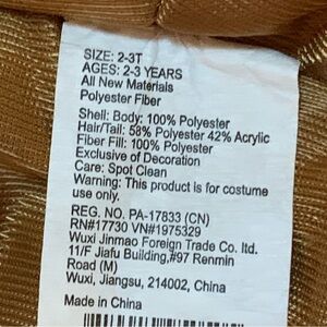 Adorable lion costume with furry texture. Features a hood with a mane and a cute face. Zip closure. Perfect for dress-up and play.