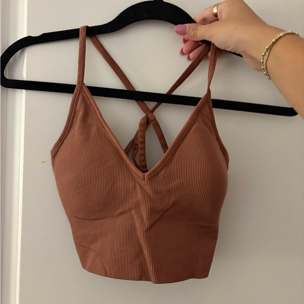 Stylish ribbed tank top. Features crisscross straps. Perfect for casual wear.