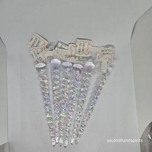 The product is a lot of 6 iridescent icicles from the Target Bullseye Playground 2025 Christmas collection. These plastic icicles are clear in color and are perfect for adding a festive touch to your holiday decor. The unique iridescent finish gives them a beautiful shimmer that will sparkle in the lights. Ideal for decorating your Christmas tree or outdoor space, these Target icicles are a fun and playful addition to your seasonal display.