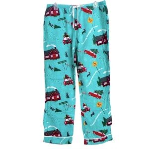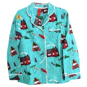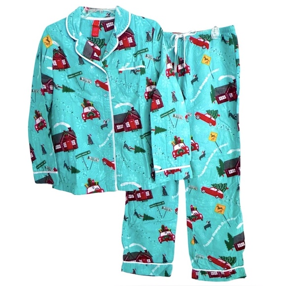 Target brand aqua blue/green color pajama set, includes pants and button down top, features trip to grandmas house graphics and "Dashing through the Snow" lettering.