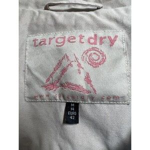 This stylish Target Dry women's jacket in size M features a belted, beige, short trench coat design with a cotton nylon blend outer shell and polyester lining material. The jacket has a button closure and embroidered logo accents, adding a touch of elegance.