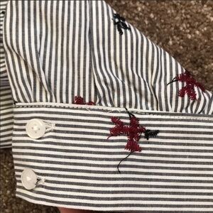 This has never been worn. I still have tags that I took off! It’s such a cute top but it’s too small for me! Some loose threads on the embroidery but that’s how it came