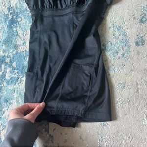 Black all in motion exercise dress in xs with built in bra and shorts with 2 pockets and adjustable straps. Only worn once