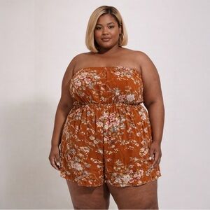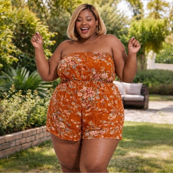 Strapless romper with all-over floral print. Elasticized waist and neckline for a snug fit. Lightweight, breezy fabric for warm days. Casual and easy to style for outings. 3X