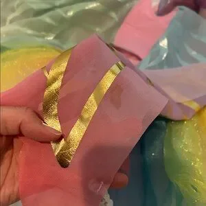 Sparkly white tulle dress with a pastel floral bodice and multicolor rainbow peplum. Features layered glittery skirt and ruffled rainbow organza accents for a whimsical look. Gold ribbon waist detail adds a polished finish. Comfortable, eye-catching costume in white and multicolor. Size 4-5T. Has a battery pack inside the dress for it to light up at night.