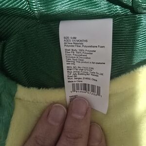 Adorable triceratops costume with green scales and yellow front. Features a hood with horns and a tail. Ideal for Halloween fun.