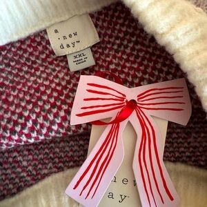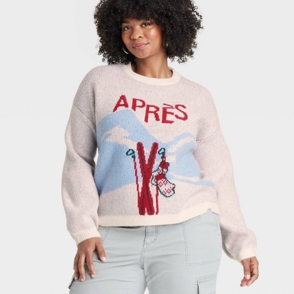 Target Holiday Crewneck Sweater A New Day Cream Blue Red Apres Ski Size XXL NWT. Prep your cool-weather wardrobe with this Crewneck Cozy Knit Pullover Sweater from A New Day. Made from a midweight recycled polyester-acrylic blend, this crewneck sweater keeps you comfortable during any activity, while spandex in the construction lends a flexible fit that moves with you. This pullover sweater boasts a cozy knit design with drop-shoulders, long sleeves, ribbed edges and a mid-length hemline. Measurements are approximately 24” inches underarm to underarm and from shoulder to hem approximately 24” inches. Just adorable ⛷️
