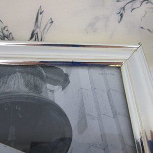Silver tone metal 3.5 x 5 photo frame. Black velvet slide in back, easel stand for horizontal or vertical display. Measures 4.25" x 5.75. In good gently used condition, a few scratches noticed. This is not silver or silver plate. Open to offers, bundle with other items for discount and savings on shipping.