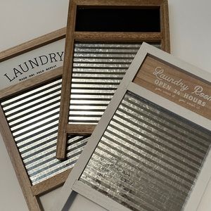 NEW! Laundry wash boards. Bullseyes Playground. Material wood, metal, chalk. Styles; laundry wash dry fold repeat, chalkboard, laundry room open 24 hours you wear it you wash it. Color white stain, light stain, dark stain. Dimensions 7 1/4” width x 12” height.