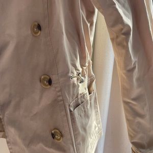 Lightweight, trench coat material. Waist can be adjusted to be more fitted. Hits right at the hip.