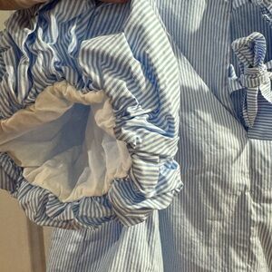 Chic light blue blouse with subtle stripes. Features puff sleeves and a stylish bow detail. Perfect for casual elegance.