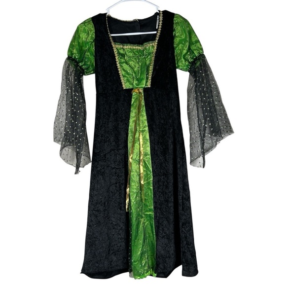 Enchanting kids costume from Target. Features a vibrant green bodice with flowing black sleeves. Perfect for Halloween fun.