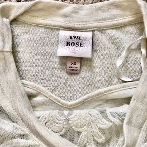 Cute but casual top. Looks like a sweatshirt but isn’t as heavy. The lace detail in the front is not see through except for right around the neckline. Worn and washed a few times but still has life left!
