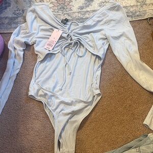 Stylish light blue bodysuit with ribbed texture. Long sleeves and scoop neckline. Open back. NWT Pale blue. Never worn wild fable