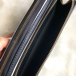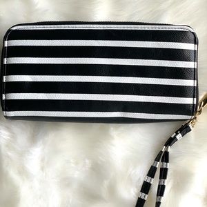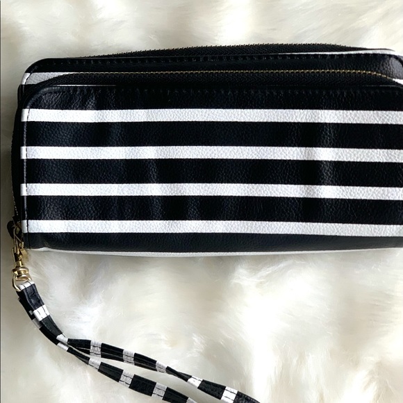 Long wallet with double compartment in black and white stripes. This can hold a lot of cards and you can even put your phone in the front compartment. Indentations on front due to storage- I’m sure will go away with use. Any marks or stains shown in photos.