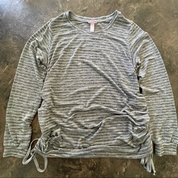 EUD. Lightweight sweater material. The color is silver/gray and has a bit of shine to it. Corset-like ties on the bottom sides of sweater.