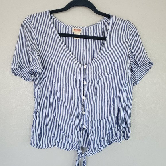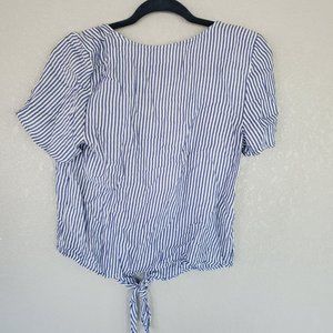 Blue and white pin strip. Tie in the front. Button down. Cute summer top. Could be dressed up or down. See photos. B26-7