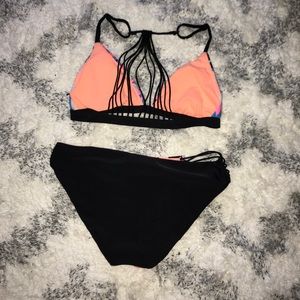 This bikini has a super stylish graphic design and the cutest details! Top and bottom are both small, this is a super flattering swim suit. Worn once, as pictured ;)