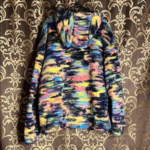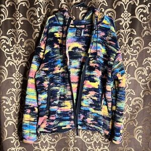 Vibrant fleece jacket with a multicolor pattern. Features a full zip front and hood.