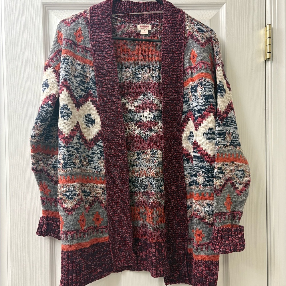 Stylish cardigan with vibrant patterns. Features red, gray, and orange tones. Perfect for layering. Smoke free home. Make an offer!