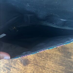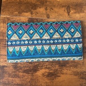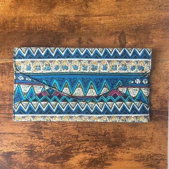 Vibrant clutch with geometric patterns. Features blue, gold, and pink accents. Perfect for any occasion.