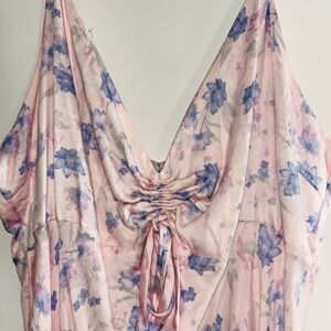 Chic strapless dress with floral pattern. Soft pink base with blue flowers. Perfect for summer outings.