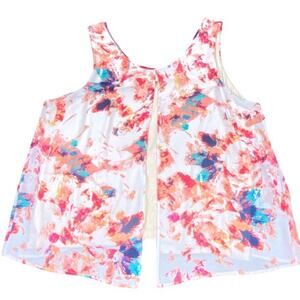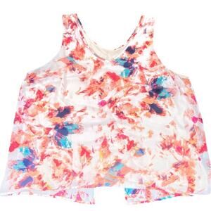 Women's split back multicolor tank top in shades of peach & cream from Target. Fully lined. The inner liner is a pastel peach color. No size tag - See Measurements. 100% Rayon. Machine wash cold, dry flat. Due to light & screen variations, colors may vary slightly from the images