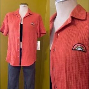 Worn once, a medium, soft button down shirt with a small rainbow, from Target’s #takepride collection