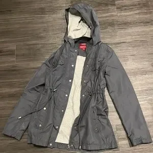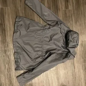 Very lightweight comfortable rain jacket. Cotton liner on the inside. Not thick by any means so you’d want to layer if wearing in winter. Great for light rain days and running errands around town.