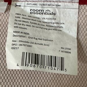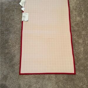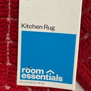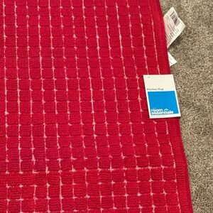 Stylish rug by Target. Features a red grid design. Made from cotton and polyester blend. Easy care instructions included. 24”x34”. It’s labeled a kitchen rug but I think you could use it anywhere you’d like to add some red. Rubber backing. NWT.
