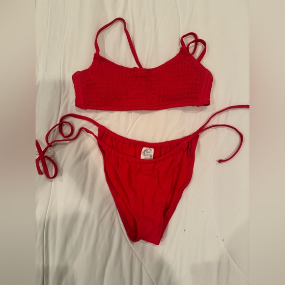 Stylish red bikini set from Target. Features a smocked top and tie-side bottoms. Perfect for the beach.