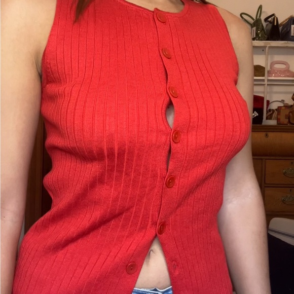 Chic red tank top with button-up front. Sleeveless design for versatile styling. Ideal for casual or dressy occasions.