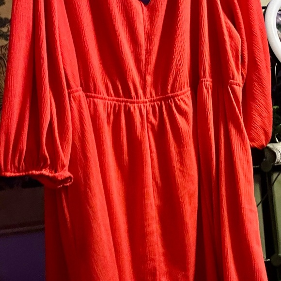 orange v-neck dress, NWT. Never worn. Capped sleeves, stretchy waist. Hits me above the knee at 5’5”