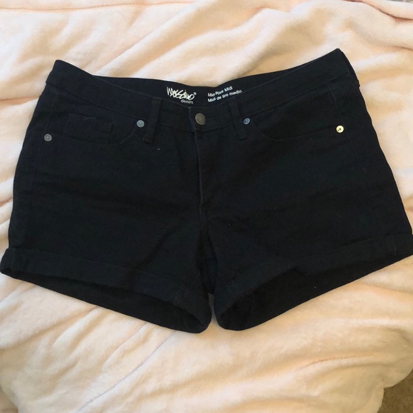 These are mid-rise black shorts from Target. They have never been worn because they are too small for me.