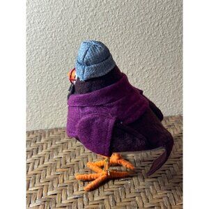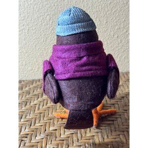 This handcrafted plush bird ornament features a sophisticated look with a coat, glasses, and a hat.