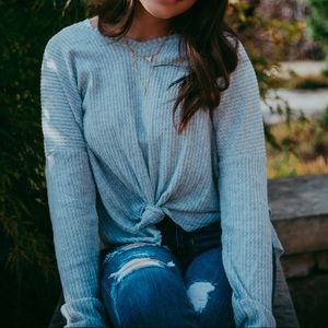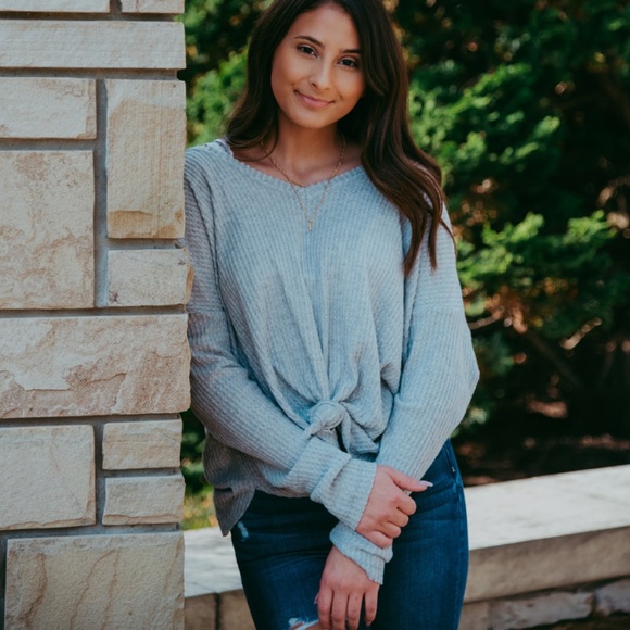 light grey, THIN sweater from target. the back is super long (longer than appears in the photos) and the v-neck is deeper than worn in the pictures! in these pictures it is pulled back more. the knot does untie if wanted! I currently only have pictures of it on, but i will post them off if thats preferred! worn once. flexible sizing! fits like a medium too