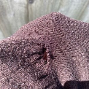 Mossimo sweater from target. Super comfortable and flattering! There is a small hole along the seam at the top of the arm which can easily be sewn.