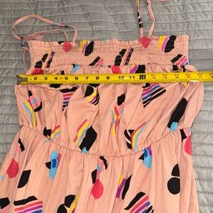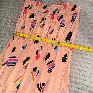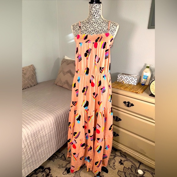 Target Take Pride 60% cotton poly blend long thin tie up shoulder straps, long a-line maxi dress. Great summer base coral color with graphic multicolor print dress. Beautiful, happy & fun dress. For a tea party or a trip to the beach or any summer time fun event. Women’s size Large.