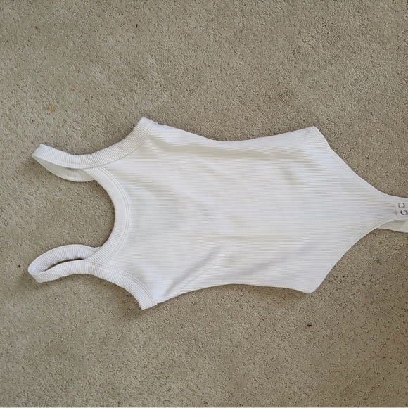 Sleeveless ribbed tank bodysuit. Scoop neckline and snap closures at the bottom. Soft stretch knit fabric. Minimal, versatile style for layering or wearing alone.
