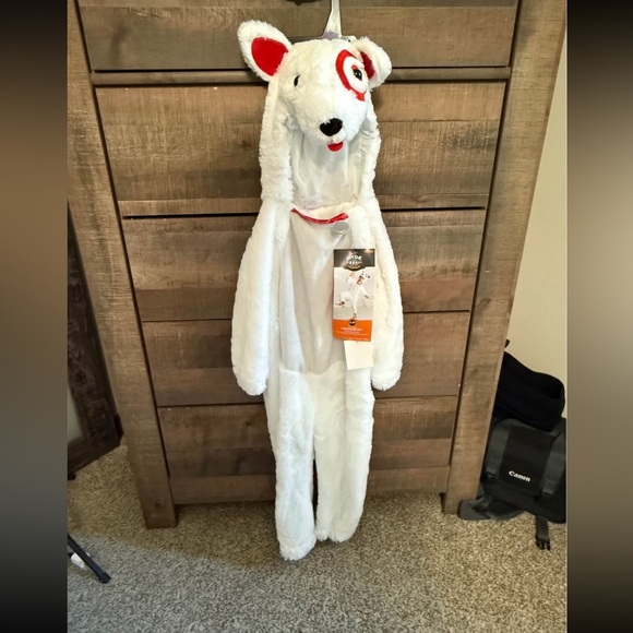 Charming dog costume with Target's bullseye design. Soft white fabric with red accents. Ideal for Halloween fun.