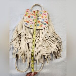Stylish beige backpack featuring playful colorful accents and fringe detailing. Perfect for adding a fun touch to any outfit.