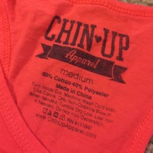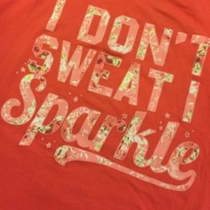 Coral colored workout tank, cotton fabric, size medium. Reads "I don't sweat I sparkle" in floral lettering across the front. Racerback tank, and fits true to size.