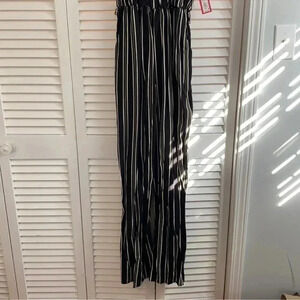 This Xhilaration romper features a stylish black and white striped pattern with an open back design. The long pants provide a sleek and sophisticated look, while the stretch turtleneck ensures a comfortable fit. Perfect for a night out or a special occasion, this romper combines style and comfort in one fashionable piece.