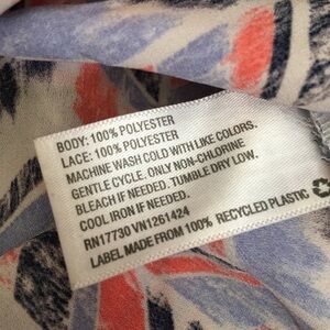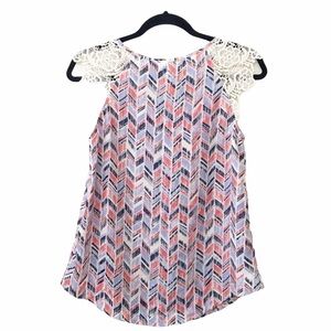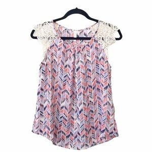 Chevron geometric patterned tank style blouse with lace embroidered cap sleeves. Preowned but in good condition.