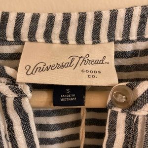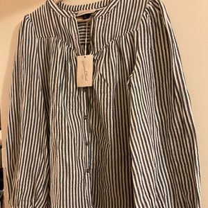 Size small but could fit a medium because of its oversized style. Blue and white stripes. It’s long sleeved but the material is light so it could be worn in the spring and summer as well.