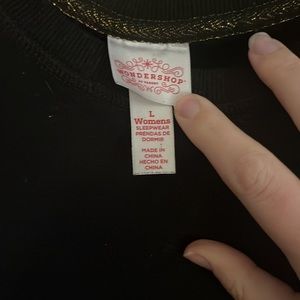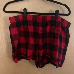 Set contains black, crewneck sweatshirt, and red and black flannel PJ shorts.